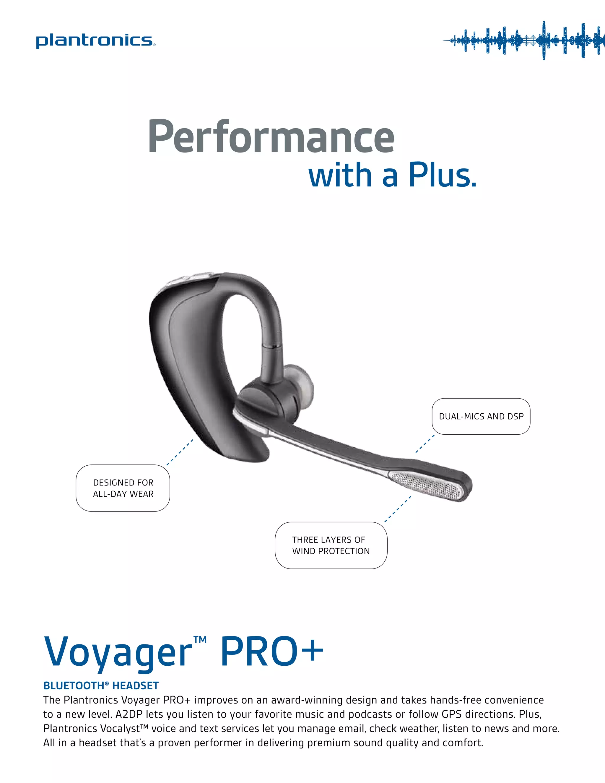 The Plantronics Voyager PRO+ Bluetooth headset improves on an award-winning design with additional features like A2DP support for listening to music and podcasts, and access to voice and text services through Plantronics Vocalyst. It provides up to 6 hours of talk time and 5 days of standby time, with dual-mic audio noise cancellation and three layers of wind protection. Additional features include quick pairing, support for connecting to two devices simultaneously, and voice alerts for battery life and call status.