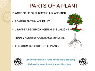 Plants need sun, water, air and soil to survive. They have different parts like leaves, stems, roots and flowers. Leaves absorb sunlight and oxygen, roots absorb water and minerals, and stems support the plant. There are different types of plants like trees, bushes and grass. Some plants lose their leaves in autumn while evergreen trees keep their leaves all year. Plants reproduce through seeds contained in fruit or through pollen carried by wind or insects. Plants are important as they provide food, oxygen and homes for animals.