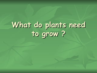 Plants need water, sunlight, nutrients from soil, and the right temperatures to grow properly. Water is necessary for plants' growth and survival. Green plants use sunlight to photosynthesize and produce their own food. Plants also require minerals found in soil for healthy growth. Temperatures that are too cold or too hot can impact a plant's growth.