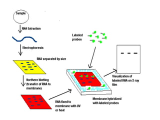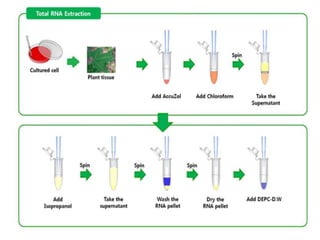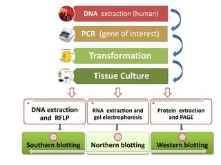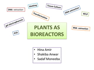 The document discusses using plants as bioreactors to produce and extract DNA, RNA, and proteins. It describes the principles and applications of various molecular biology techniques including DNA extraction, polymerase chain reaction (PCR), plant transformation, tissue culture, restriction fragment length polymorphism (RFLP), Southern blotting, RNA extraction, gel electrophoresis, Northern blotting, protein extraction via polyacrylamide gel electrophoresis (PAGE), and Western blotting. These techniques can be used to analyze genetic diseases, produce copies of genes of interest, create disease resistant plants, and express proteins for applications such as synthetic hormones, antibodies, and artificial organs.