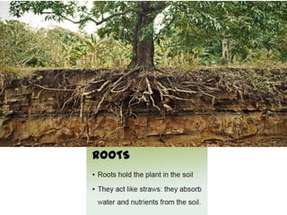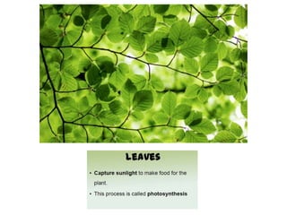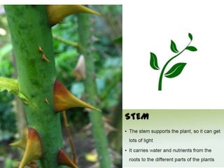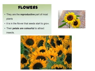 Plants grow from seeds that develop roots and shoots, with leaves that perform photosynthesis to produce food for the plant. The main parts of a plant include roots that take in water and nutrients, a stem that provides structure and support, and leaves where photosynthesis occurs to produce food for the plant using sunlight, water and carbon dioxide. The document asks questions about plant growth, parts and care to assess the reader's knowledge of basic plant biology.