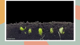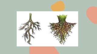 The document discusses different plant structures and their functions. It explains that seeds contain a radicle and plumule, where the radicle grows into the roots below ground and the plumule grows into the stem above ground. Roots have two types - taproots and fibrous roots. The stem contains nodes and internodes and bears leaves, flowers and fruits. Leaves have a lamina, petiole and base, and perform photosynthesis. Leaves have two venation patterns - reticulate and parallel venation.