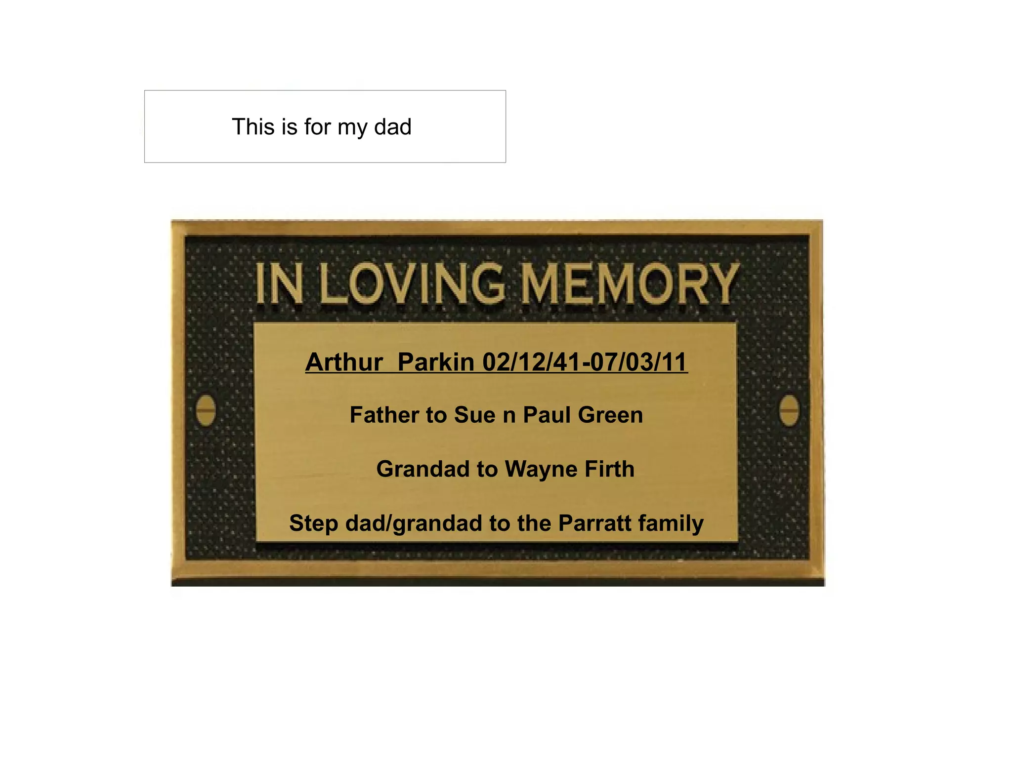 Arthur Parkin was the father of Sue and Paul Green and grandfather of Wayne Firth, as well as step-father and step-grandfather to the Parratt family. He lived from February 12, 1941 until July 3, 2011. This memorial was created for Arthur Parkin, who was known as "dad" to the person who made the memorial.