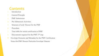 The Plasma Master File (PMF) is a comprehensive documentation essential for ensuring the quality and safety of human plasma used in medical products and is distinct from marketing authorization dossiers. Submitted and updated annually, its certification involves a structured evaluation process with defined timetables by the European Medicines Agency. The PMF submission requires specific documentation organized within the eCTD structure, including a cover letter, application form, and compliance certificate.