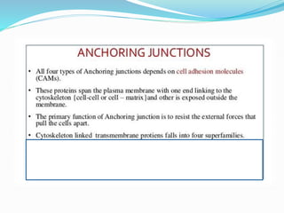 The plasma membrane is the outer covering of cells made of lipids and proteins organized into a phospholipid bilayer. It protects the cell by forming an outer boundary, aids in digestion by taking in food and removing waste, and demonstrates selective permeability to control transport across the membrane. Additionally, cell adhesion molecules on the plasma membrane help cause inflammation, and junctions form with cytoskeletal assistance.
