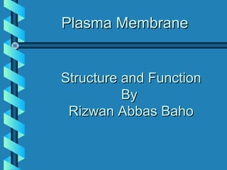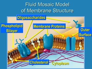 The plasma membrane forms a boundary around cells and controls what enters and exits. It is made of a phospholipid bilayer, proteins, and cholesterol. The bilayer forms a fluid mosaic with phospholipids providing structure and proteins facilitating functions like transport. Transport across the membrane includes passive diffusion of lipids and active transport of ions and molecules using protein carriers fueled by energy. Endocytosis and exocytosis move larger particles in and out using vesicles. Cell junctions allow communication between animal and plant cells.