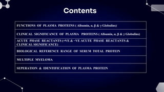 The document discusses plasma proteins, focusing on albumin, globulins, and their clinical significance, including conditions like hypoalbuminemia and hyperalbuminemia. It details the composition, functions, and diagnostic importance of various plasma proteins, including their role in diseases like multiple myeloma. The document also describes the acute phase response and the methods for estimating and analyzing plasma protein levels.