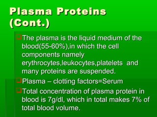 The plasma is the liquid portion of blood that contains proteins like albumins, globulins, fibrinogen, and immunoglobulins. The main classes of globulins are alpha, beta, and gamma globulins. Immunoglobulins, also called antibodies, are gamma globulins that recognize and bind to antigens with high specificity. The five major classes of immunoglobulins in humans are IgG, IgM, IgA, IgD, and IgE, which have different structures and functions. Multiple myeloma is a cancer of plasma cells that results in overproduction of a single immunoglobulin class.