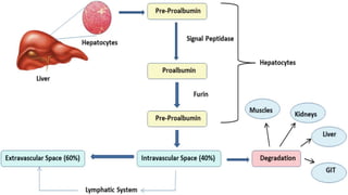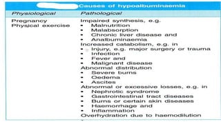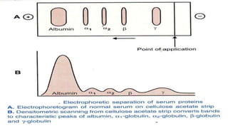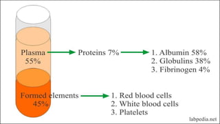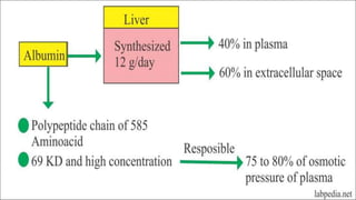 Plasma is the liquid portion of blood that remains after red and white blood cells are removed. It contains water, salts, enzymes, antibodies, and proteins. The major plasma proteins are albumin, globulins, and fibrinogen. Albumin is the most abundant plasma protein and plays important roles in maintaining colloidal osmotic pressure and transporting molecules like fatty acids, hormones, and bilirubin. Low albumin levels can cause edema. Globulins are divided into alpha, beta, and gamma classes, and include proteins like ceruloplasmin, transferrin, C-reactive protein, and haptoglobin that have clinical significance as markers of disease states.