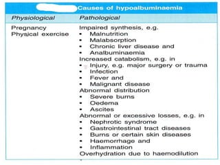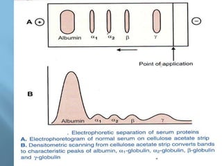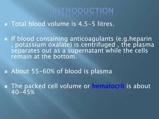 This document provides information on plasma and plasma proteins. It discusses that plasma constitutes 55% of blood volume and is composed mainly of water (91%) and proteins (8%). The major plasma proteins are albumin, globulins, and fibrinogen. Albumin makes up 60% of total plasma proteins. Various plasma proteins and their functions are described in detail. Abnormalities in plasma proteins can provide clinical information on diseases.