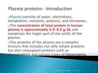 The document discusses the proteins found in human plasma. It describes how plasma proteins can be separated into fractions including albumin, globulins, fibrinogen, and others. Specific plasma proteins are then discussed in more detail, including their structure, function, concentration in plasma, and clinical significance. Albumin, the most abundant plasma protein, is highlighted for its roles in maintaining colloidal osmotic pressure and transporting various substances through the bloodstream.