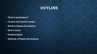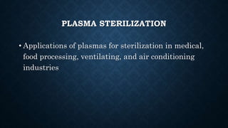 This document describes a plasma sterilizer. It begins by explaining what sterilization and plasma sterilization are. Plasma sterilization uses mechanisms like free radicals, UV/VUV radiation, and volatilization to eliminate microorganisms. It then discusses different methods of plasma sterilization like dielectric barrier discharge, inductively coupled plasma, and atmospheric pressure plasma jets. The document concludes by providing details about a specific low-temperature plasma sterilizer model made by Tuttnaurer, including its features, sterilization programs, and use of a process challenge device.