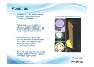 Plasma Antennas Ltd, founded in 2001, is a leader in advanced electronic beam-steering antenna technologies, aiming to capitalize on high-growth markets with innovative plasma technology. The company offers a range of products, including dual polar patch arrays and ultra-wideband systems, designed for various applications such as mobile broadband, secure networks, and homeland security. Their focus on custom solutions and cutting-edge capabilities positions them effectively for future telecommunications advancements like 5G.