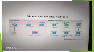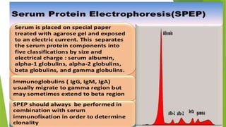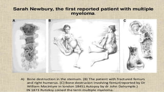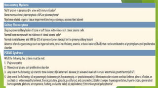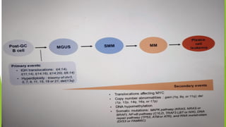This document discusses plasma cell disorders, primarily focusing on multiple myeloma, Waldenstrom's macroglobulinemia, and related conditions, outlining their definitions, epidemiology, risk factors, clinical features, diagnosis, and treatment strategies. It highlights the malignant proliferation of plasma cells, the associated clinical manifestations, and the specific management approaches for different stages and symptoms of these disorders. The treatment recommendations include systemic therapy, high-dose therapy with autologous stem cell transplantation, and supportive care measures tailored to each patient's needs.