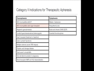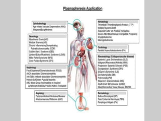 This document discusses plasmapheresis, which is a process that separates plasma from the blood. It has several indications including autoimmune diseases and thrombotic thrombocytopenic purpura. There are two main techniques, centrifugal plasma separation and membrane plasma separation. Membrane plasma separation uses hollow fiber membranes to separate plasma while retaining blood cells. Plasmapheresis procedures typically exchange 1-1.5 plasma volumes and are often done daily or every other day for 5-10 days to deplete pathogenic molecules by 90%. Complications can include hypocalcemia if citrate is used as an anticoagulant or bleeding if higher doses of heparin are needed.
