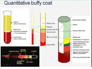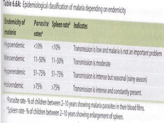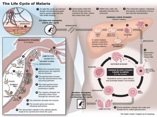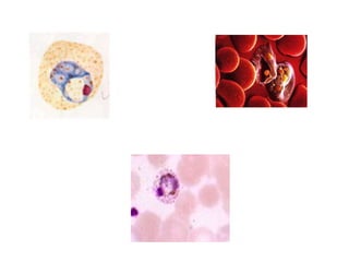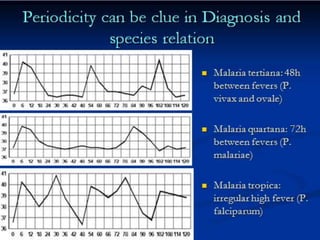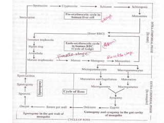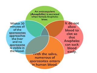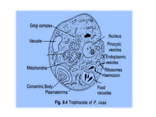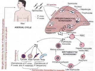 This document describes the key characteristics of four species of Plasmodium that infect humans and cause malaria: P. falciparum, P. vivax, P. malariae, and P. ovale. It covers their morphology, life cycles, symptoms caused, and distinguishing features. P. falciparum is the most dangerous species and causes malignant tertian malaria. P. vivax can cause relapse of infection through dormant liver stages called hypnozoites. The life cycles involve alternating asexual replication phases in the human host and sexual phases in the Anopheles mosquito vector.
