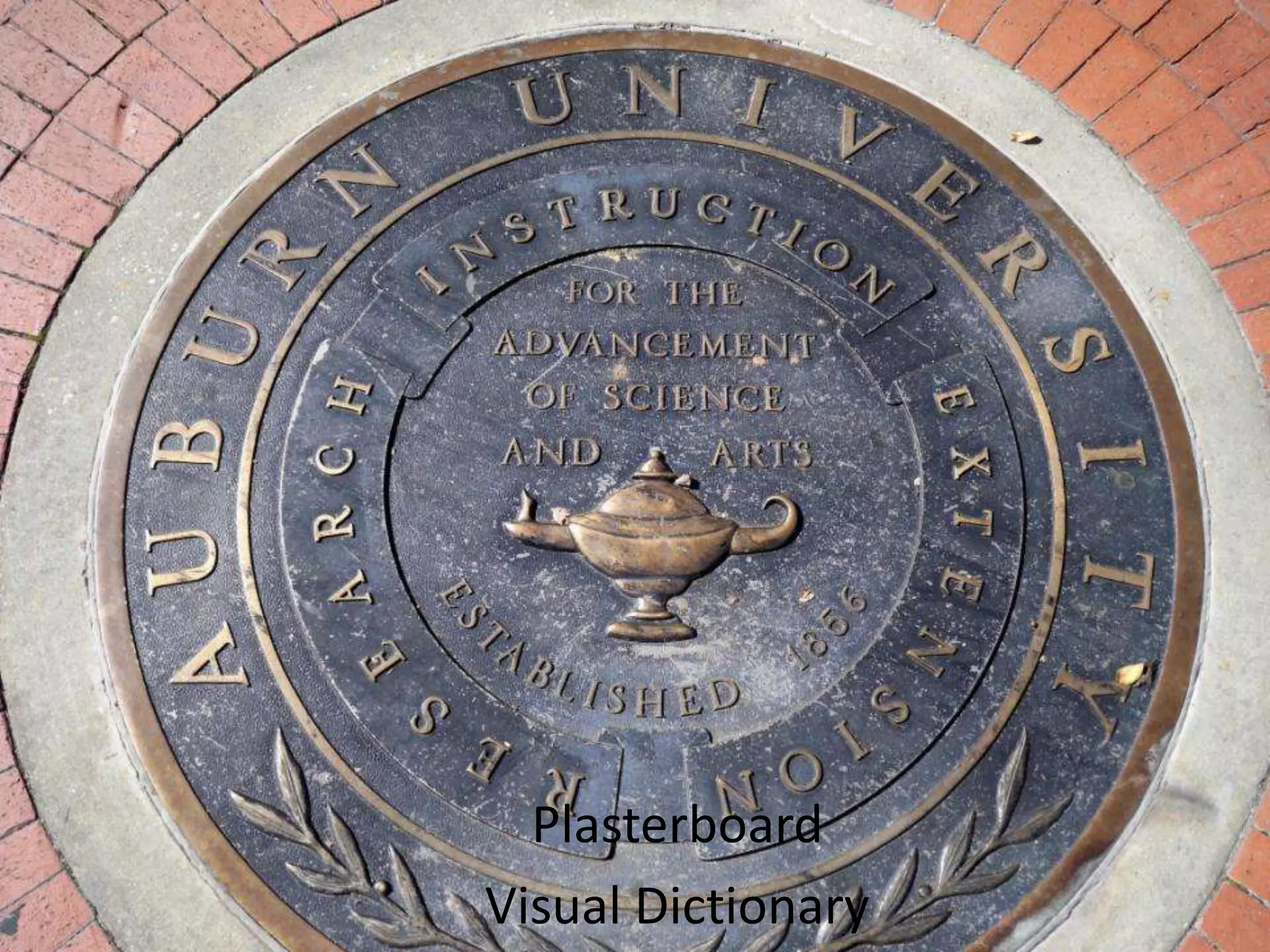 The document provides definitions and descriptions of various construction materials and components. It describes items like plasterboard, soffit vents, ridge vents, gable vents, roof turbines, backhoes, batter boards, brick bonds, bricks, bulldozers, siding materials, windows, stairs, control joints, concrete masonry units (CMU), framing components, doors, electrical components, heating and air systems, insulation, plumbing fixtures, and drainage elements. Dimensions and purposes of each item are given.