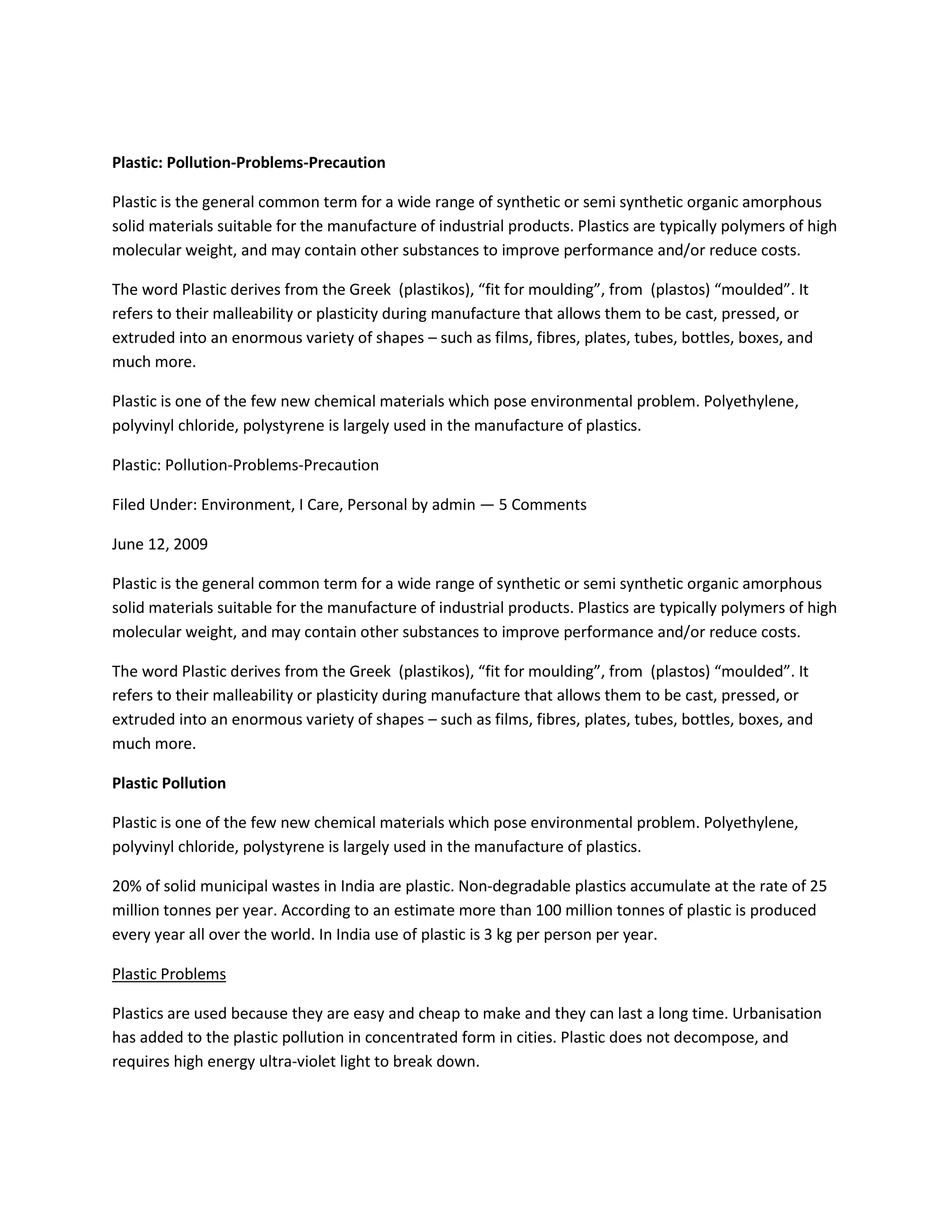 The document discusses the environmental problems caused by plastic pollution. It notes that plastic is made from toxic chemicals and does not degrade, accumulating in the environment. Plastic clogs drains, contaminates water and soil, and provides breeding grounds for mosquitoes. When burned or landfilled, plastic releases additional toxic chemicals into the air and water. The only way to address the problems is to reduce plastic use as much as possible and avoid it when alternatives are available.