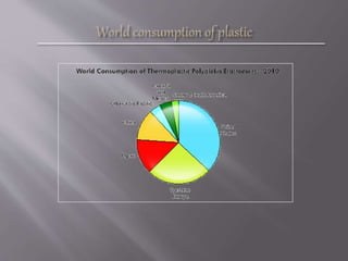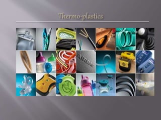 Plastic is a synthetic material made from organic polymers that can be molded into various shapes. There are two main types of plastics: thermoplastics and thermoset plastics. Thermoplastics soften when heated and harden when cooled, allowing them to be remolded and recycled. Thermoset plastics harden permanently once molded. Plastics have a variety of applications due to their properties like corrosion resistance, low cost, and ability to be molded into complex shapes. However, they also have weaknesses like low strength and sensitivity to heat and chemicals.