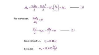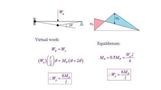 This seminar discusses plastic analysis, which is used to determine the collapse load of structures. It introduces key concepts like plastic hinges, which form at locations of maximum moment and allow large rotations. The plastic section modulus and shape factor are presented as ways to calculate the moment capacity of a fully yielded cross-section. Common collapse mechanisms like simple beams, fixed beams under uniform and point loads, and propped cantilevers are analyzed using the static method of plastic analysis or virtual work method. Determining collapse loads for various structural configurations is demonstrated through examples.