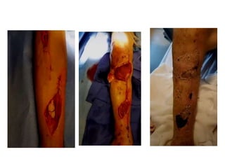 This document provides an overview of plastic and reconstructive surgery techniques. It discusses various types of grafts and flaps used to manage soft tissue defects, including split thickness skin grafts, full thickness skin grafts, nerve grafts, tendon grafts, random flaps, axial flaps, pedicled flaps, and free flaps. Specific techniques are described for cross leg flaps, biceps femoris flaps, gastrocnemius flaps, soleus flaps, and peroneous brevis flaps to cover defects in the lower limbs. Key principles of plastic surgery like adequate debridement and minimal skin tension are also summarized.