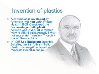 The document discusses the invention of plastics, starting with celluloid by John Wesley Hyatt in 1869 and followed by Bakelite by Leo Baekeland in 1907. It highlights the properties and advantages of plastics, including their malleability, cost-effectiveness, and potential for recycling, as well as the discovery of enzymes like mhetase that break down PET plastic. The content includes references to further readings on plastics and their impact.