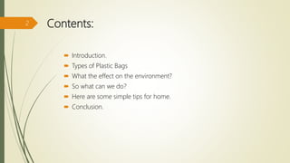 The document discusses the negative environmental impacts of plastic bags, highlighting their prevalence in nature and the harm they cause to wildlife and human health. It outlines the types of plastic bags, their effects on the environment, and suggests actionable solutions to mitigate pollution through recycling and community efforts. The conclusion emphasizes the urgency of raising public awareness and enhancing recycling facilities to protect future generations.