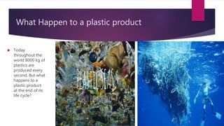 This document discusses the issue of plastic pollution and its effects. It notes that over 8,000 kg of plastics are produced every second but most plastic is not biodegradable and instead breaks down into microplastics that enter the food chain. Much of the plastic waste ends up polluting the oceans, with 6.4 metric tons entering oceans each year, where it can travel long distances and persist for hundreds of years as microplastics and potential archaeological findings on beaches in the future. This plastic pollution impacts wildlife through ingestion and entanglement. The document examines some solutions but notes the health and environmental concerns around certain chemicals used in plastics like phthalates and bisphenol A.