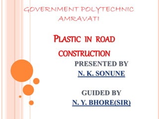 This document discusses using plastic waste in road construction. It begins by outlining the process, which involves segregating, cleaning, shredding and collecting plastic waste. There are two methods for incorporating plastic into roads - a wet process that mixes plastic directly with hot bitumen, and a dry process where plastic coats heated aggregates before adding bitumen. Using plastic in roads provides benefits like increased strength and reduced costs, while helping address the problem of plastic waste. However, there are also potential disadvantages like toxic chemical leaching during construction and use. Overall, plastic roads present an environmentally-friendly way to strengthen pavements and reduce plastic pollution.