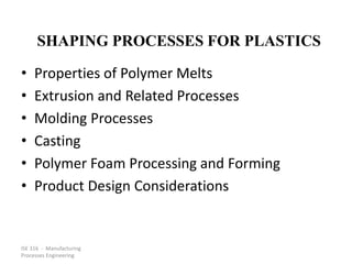 The document provides an overview of manufacturing processes for shaping plastics, focusing on polymer melts, extrusion, molding, and casting techniques. It highlights the significance of plastic shaping due to its versatility, energy efficiency compared to metals, and variety in produced geometries. Additionally, it discusses different types of plastics (thermoplastics and thermosets), their processing properties, and specific processes like injection molding and compression molding.