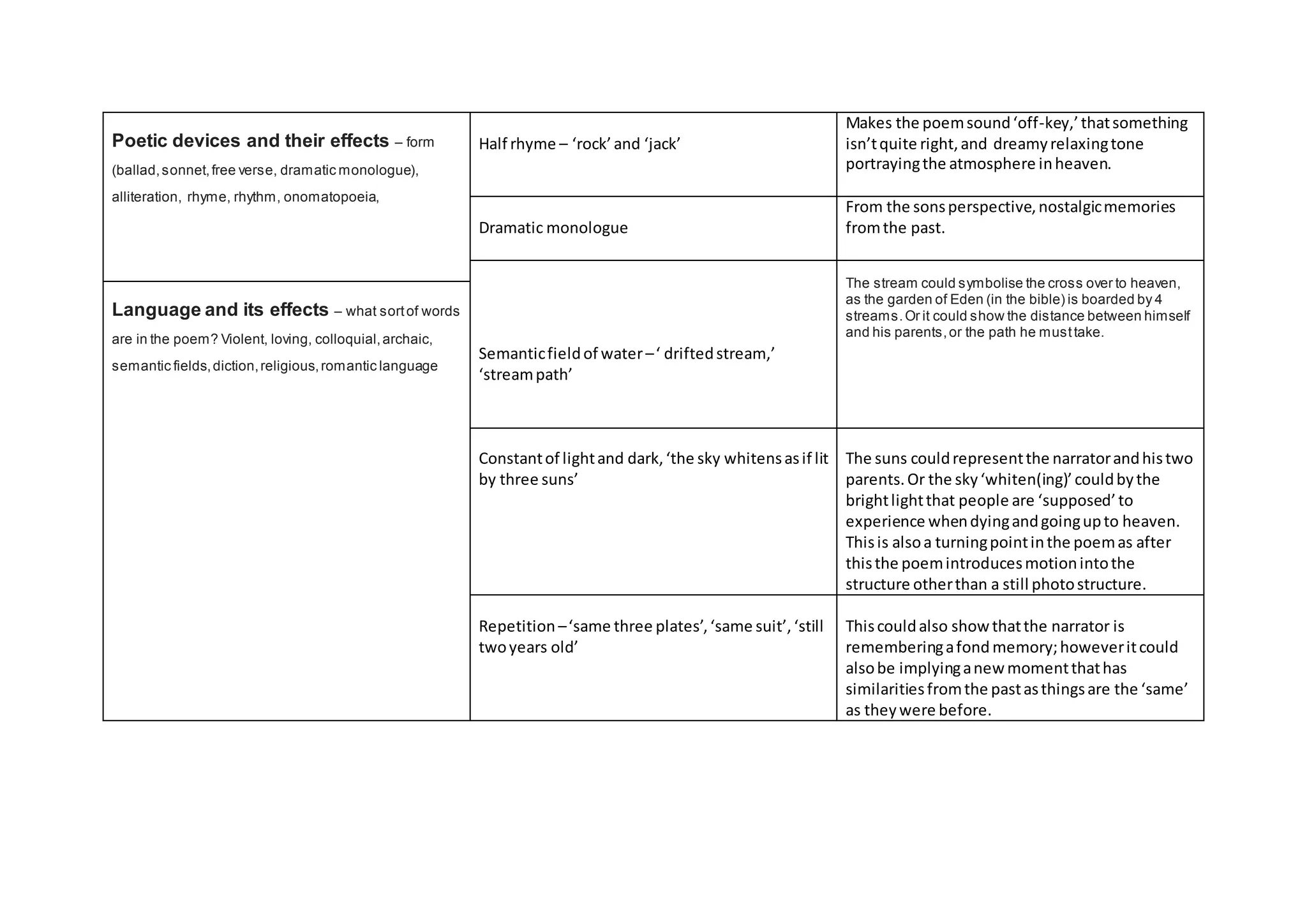 This document analyzes the poetic techniques and symbolism used in the poem "Eden Rock" by Charles Causley. It discusses various literary devices like rhyme, repetition, imagery and the effects they have on tone and meaning. Specifically, it explores how elements like the stream, clothing, and invitation from the parents can represent the narrator's memories of his family or his journey to the afterlife to reunite with his parents who passed away. The analysis considers multiple interpretations that different elements in the poem could suggest.