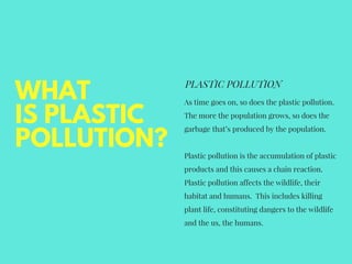 Plastic pollution is the accumulation of plastic waste that adversely affects wildlife, their habitats, and human health. Land pollution, caused by human activities, leads to the destruction of soil and increases in waste-filled land. Proper recycling practices are essential to mitigate the harmful effects of plastic and pollution on the environment.