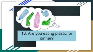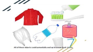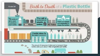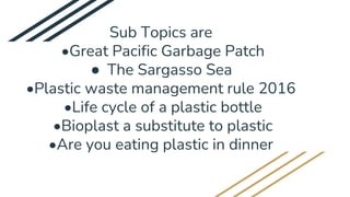 The document discusses plastic pollution through various case studies, including the Great Pacific Garbage Patch and the Sargasso Sea. It highlights important topics like the Plastic Waste Management Rule of 2016, the life cycle of a plastic bottle, and the potential of bioplastics as an alternative to conventional plastics. The document also raises awareness about microbeads found in household products.