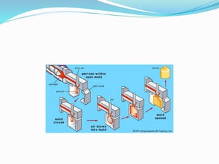 The document is a PowerPoint presentation on plastic molding processes, detailing injection molding, blow molding, and thermoforming techniques. It describes the injection molding process for creating complex parts from thermoplastic materials, the blow molding technique for producing hollow parts using parison, and the thermoforming process that forms plastic sheets under temperature and pressure. The presentation also covers machine components, materials used, and various applications for these plastic processing methods.