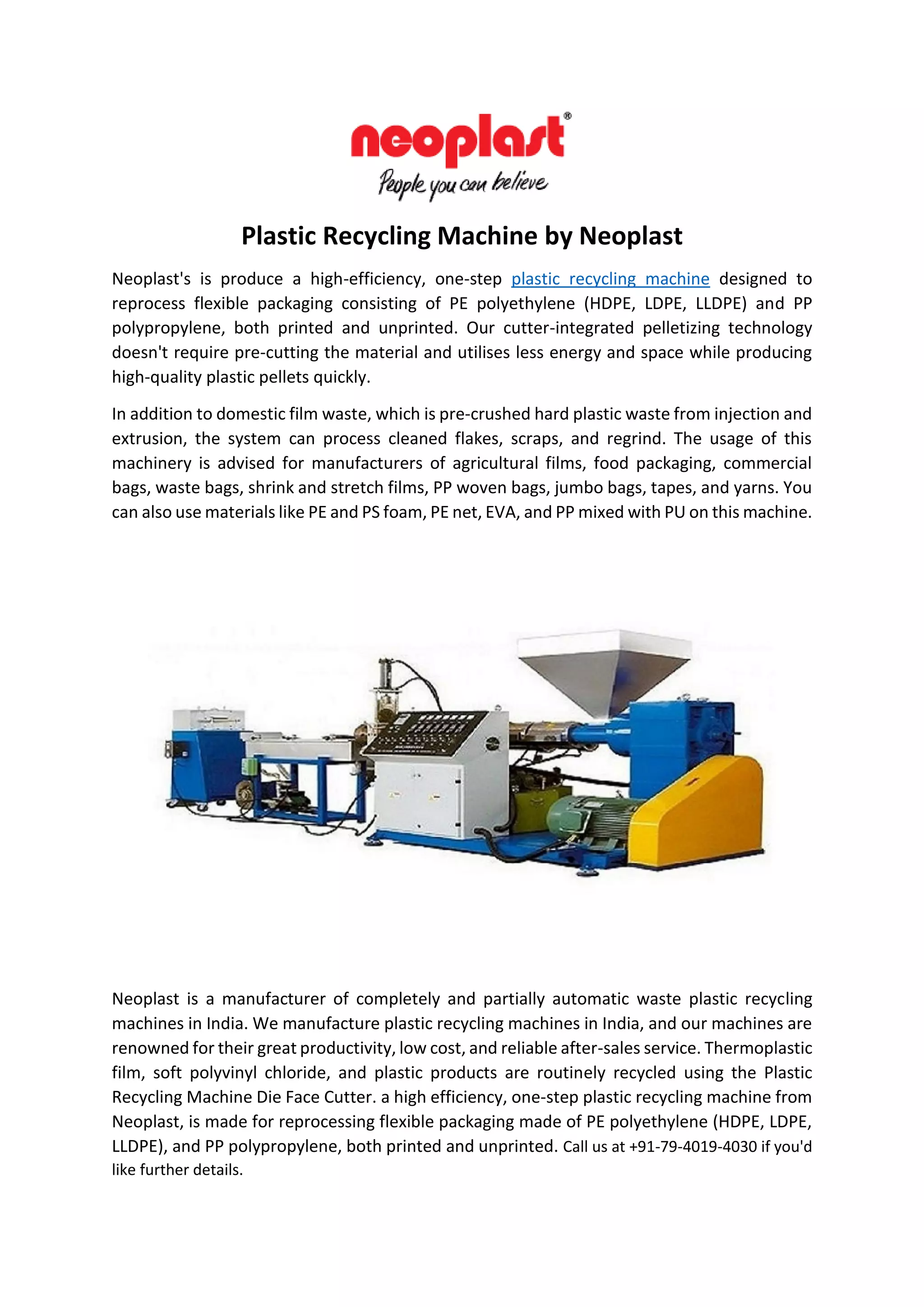 Neoplast's is produce a high-efficiency, one-step plastic recycling machine designed to