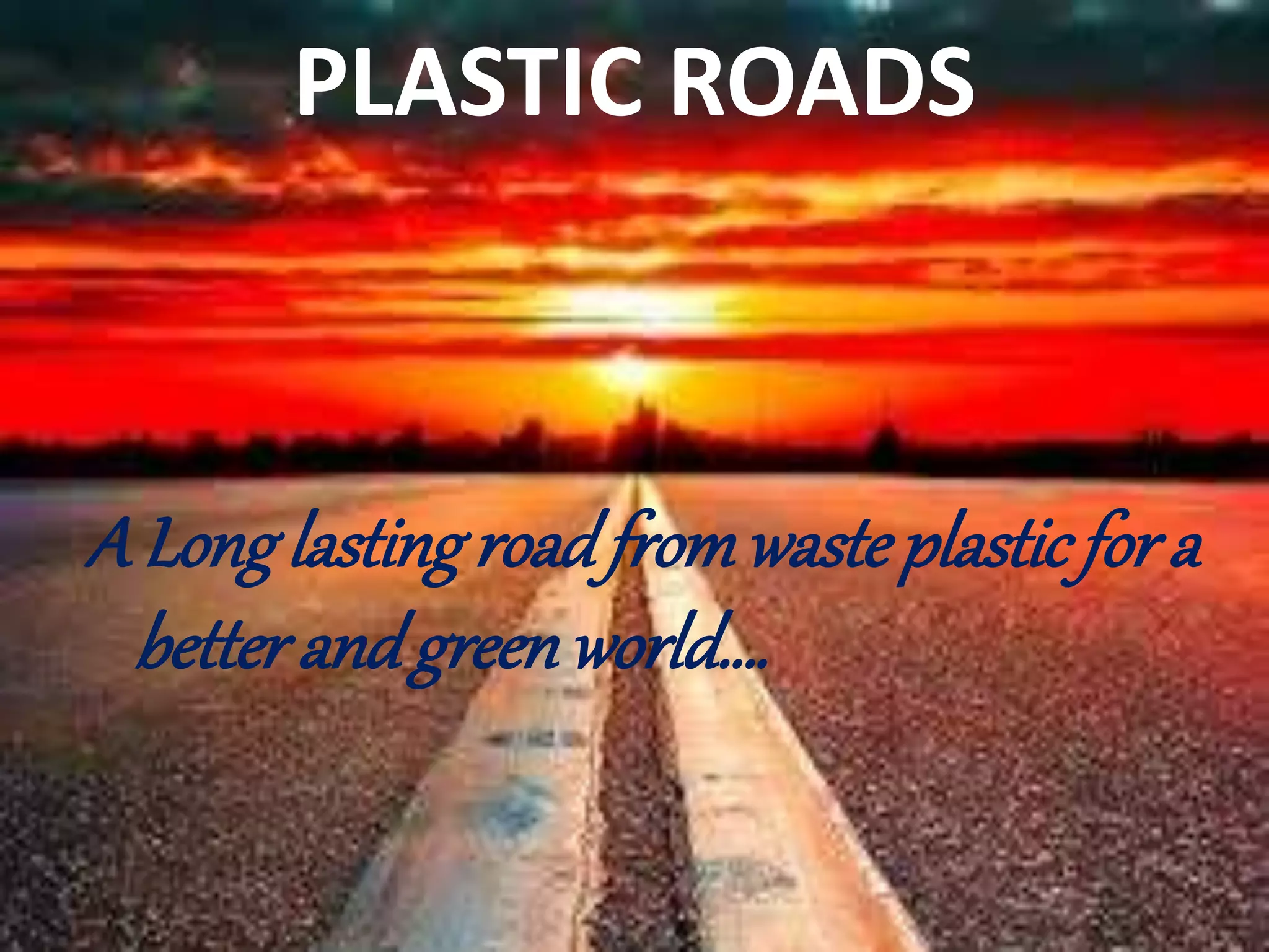 This document discusses the process of creating plastic roads using waste plastic as an ingredient in road construction material. When mixed with hot bitumen, plastics melt to form a coating over aggregate. There are two main methods - the dry process where shredded plastic is added to heated aggregate and bitumen, and the wet process which directly mixes plastic with hot bitumen. Benefits include using waste plastic, reducing bitumen needs, and increasing road strength and lifespan. However, there are also concerns about toxins leaching from the plastic during the cleaning, laying, and use of the roads.
