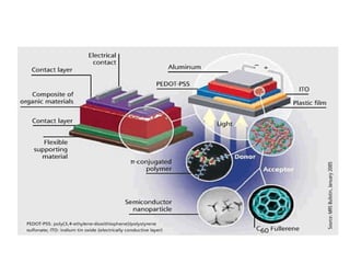 The document discusses the development and advantages of plastic solar cells using nanotechnology, highlighting their ability to harness infrared rays and produce energy efficiently even on cloudy days. Plastic solar cells are compact, flexible, and potentially more efficient than conventional cells, but face challenges such as high costs and shorter lifespans. Future improvements are aimed at enhancing their durability and lowering manufacturing costs.