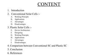 The seminar presentation discusses the development and advantages of plastic solar cell technology in comparison to conventional solar cells. It outlines the working principles, applications, and efficiency differences, noting that plastic solar cells can harness infrared rays and function under cloudy conditions, making them more versatile and cost-effective. The conclusion emphasizes the potential of plastic solar cells in reducing reliance on fossil fuels and achieving economic feasibility in energy production.