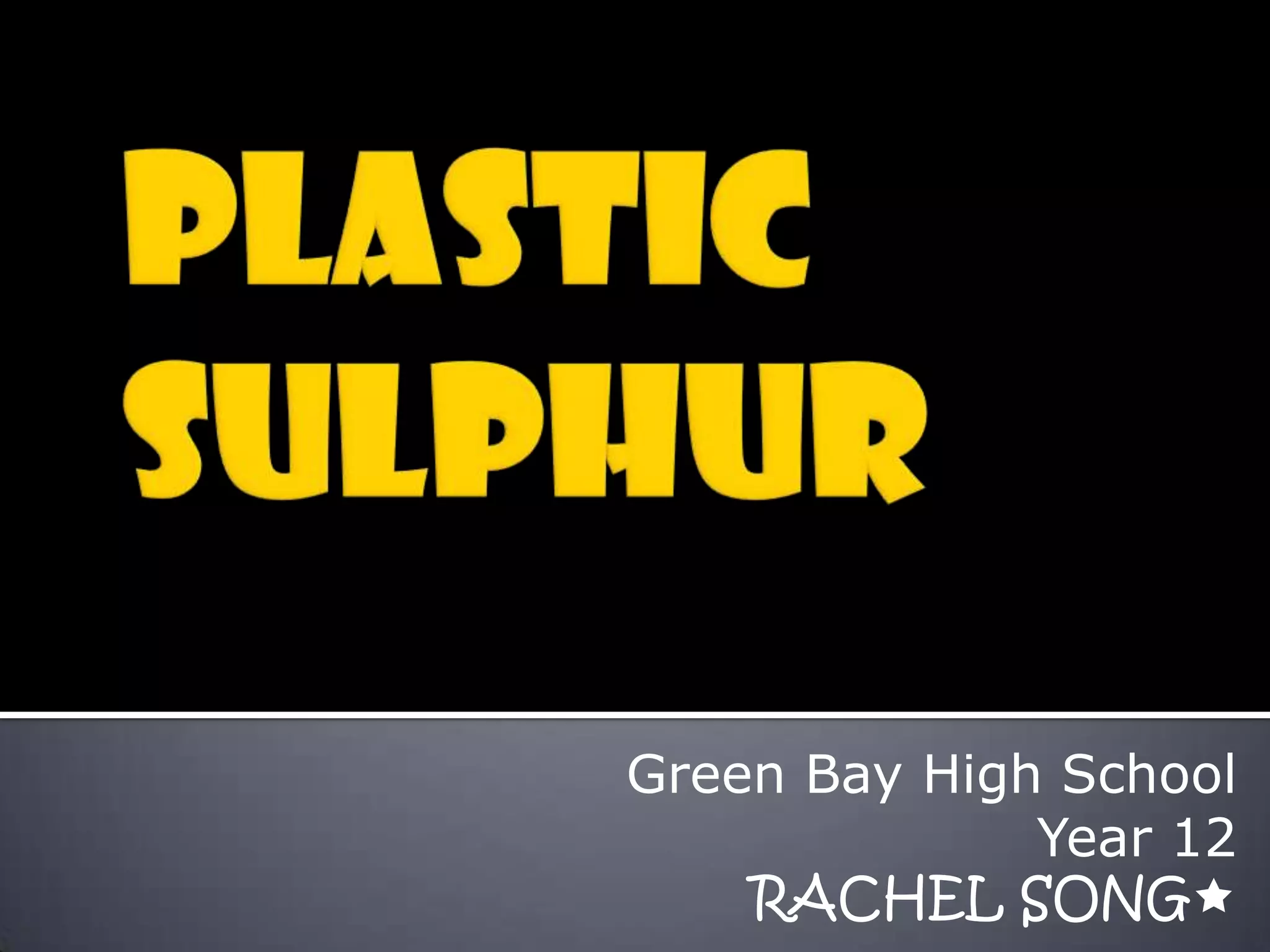Plastic sulfur is formed when molten sulfur is rapidly cooled in water. It has a rubber-like structure with sulfur chains aligned parallel to one another and held together by van der Waals forces. This plastic sulfur is unstable at room temperature as the sulfur chains slowly rearrange into crystalline structures, making the material more brittle over time. Sulfur exists in different states depending on temperature, being solid below 95.6°C, liquid from 113-445°C, and transforming from low to high viscosity as it is heated through this range.