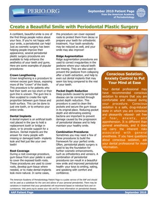 Crown lengthening, dental implants, root coverage, pocket depth reduction, and ridge augmentation are several periodontal plastic surgery procedures that can enhance smiles. Crown lengthening removes gum tissue to expose more tooth structure. Implants replace missing or damaged teeth. Root coverage grafts gum tissue to cover exposed roots. Pocket depth reduction eliminates deep pockets caused by gum disease. Ridge augmentation corrects bone loss to support dental implants or natural teeth. Combining procedures can result in an improved smile and periodontal health.