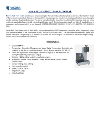 Pacorr Testing Instruments Pvt. Ltd. manufactures a range of testing equipment including digital melt flow index testers, tensile strength testers, universal testing machines, humidity chambers, impact testers, hot water baths, and muffle furnaces, all designed to evaluate the properties of materials under various conditions. These instruments comply with international standards and are equipped with advanced technology such as digital displays, microprocessor-based controllers, and automatic safety features. The company aims to provide precise and reliable testing solutions across various industries, including plastics, textiles, and metals.