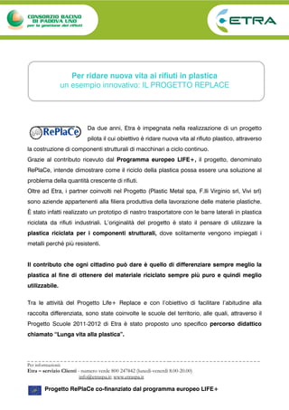 Il documento tratta dell'importanza di migliorare la raccolta differenziata degli imballaggi in plastica per ridurre rifiuti non riciclabili e minimizzare l'impatto ambientale. Viene menzionato il progetto 'Replace', co-finanziato dal programma europeo Life+, che esplora l'uso della plastica riciclata per la produzione di componenti strutturali in macchinari. Si sottolinea inoltre la necessità di un corretto conferimento della plastica per ottenere materiale riciclato di qualità, coinvolgendo anche le scuole locali in attività didattiche.