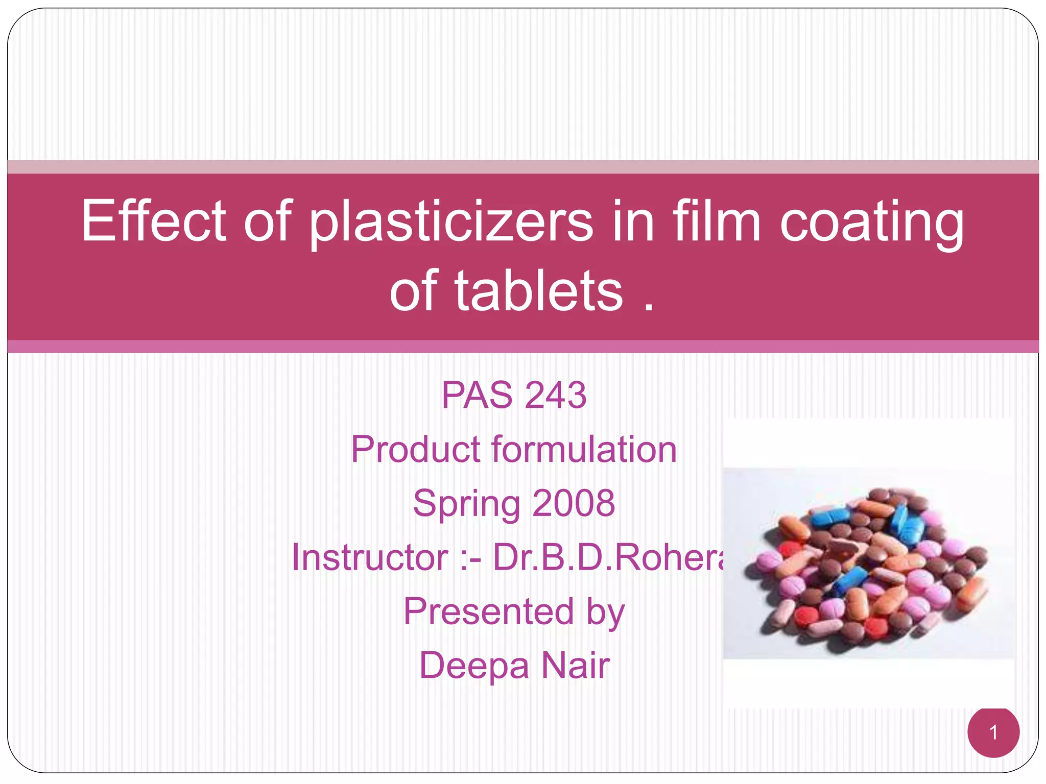 The document discusses the role of plasticizers in film coating of tablets, emphasizing their necessity for enhancing the flexibility and mechanical properties of brittle polymers like cellulose derivatives. It covers the mechanism of action, various classifications of plasticizers, their effects on film properties, and the importance of selecting appropriate plasticizers based on glass transition temperature and solubility. Additionally, it highlights the impact of curing conditions on the film characteristics and drug release rates.