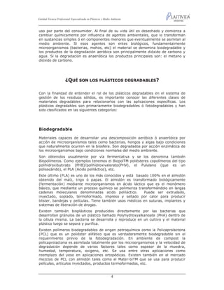The document discusses biodegradable plastics as an alternative to traditional plastics. It states that biodegradable plastics break down into water, carbon dioxide, and biomass when exposed to oxygen and microorganisms, just like dead organic matter in nature. However, biodegradable plastics still require proper disposal in industrial composting facilities to fully degrade since regular environments may not provide suitable conditions. The document also notes that biodegradable plastics are primarily produced through microbial fermentation of plant biomass.