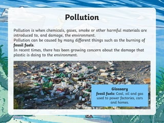 Pollution is when harmful materials damage the environment. Plastic pollution is a growing concern, as plastic is very slow to decompose and can release toxic chemicals. Plastic is used to make many everyday items but ends up polluting oceans, where it kills and endangers sea life through entanglement, ingestion, and chemical exposure. Reducing plastic use and properly disposing of waste can help address this environmental problem.