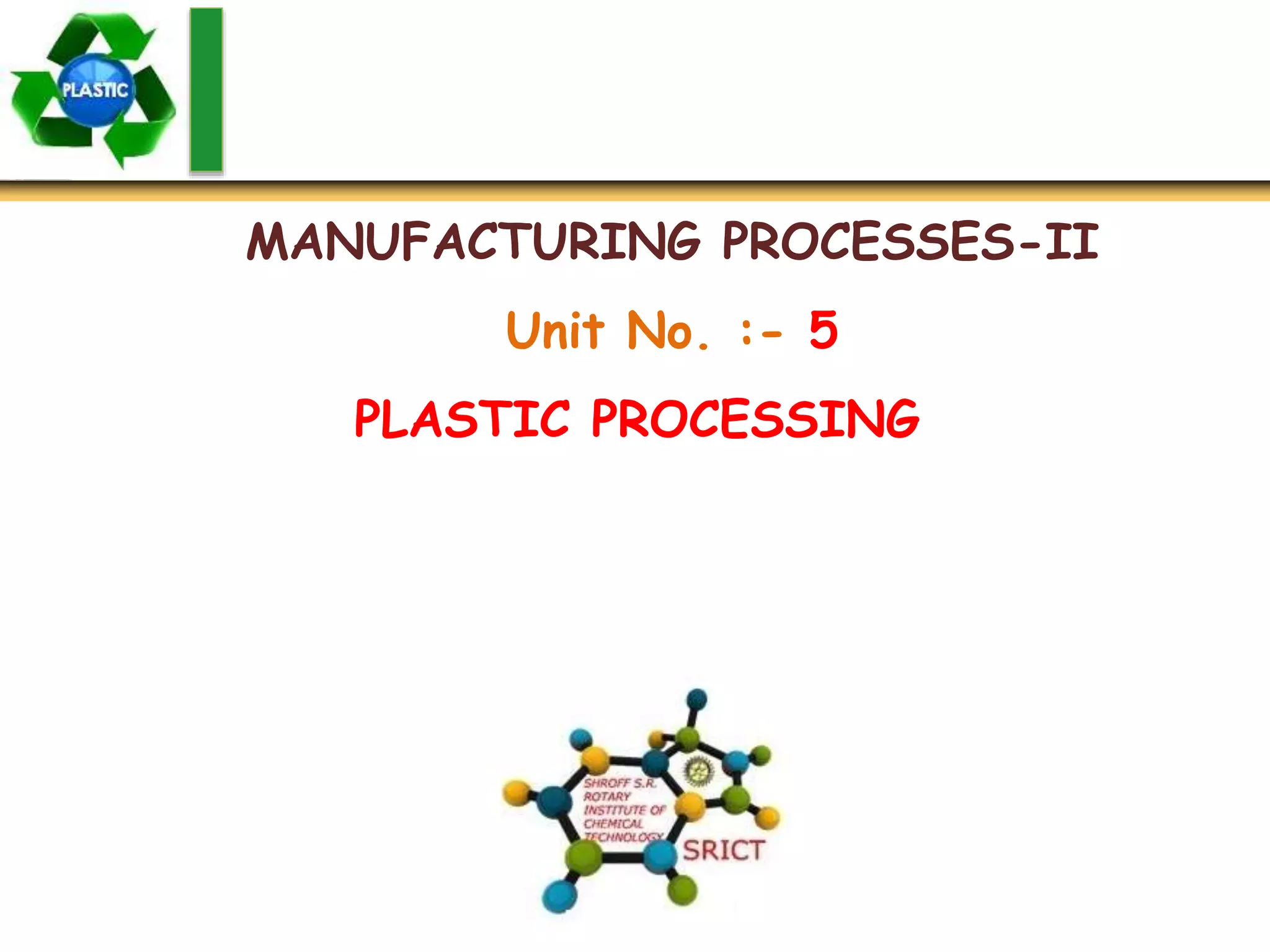 The document discusses various plastic processing and manufacturing techniques. It begins by defining polymers and explaining the polymerization process. It then classifies plastics according to their behavior when heated, structure, and physical/mechanical properties. Common plastic manufacturing processes are described like compression molding, transfer molding, and injection molding. Additives used in plastics and properties of plastics are also outlined.