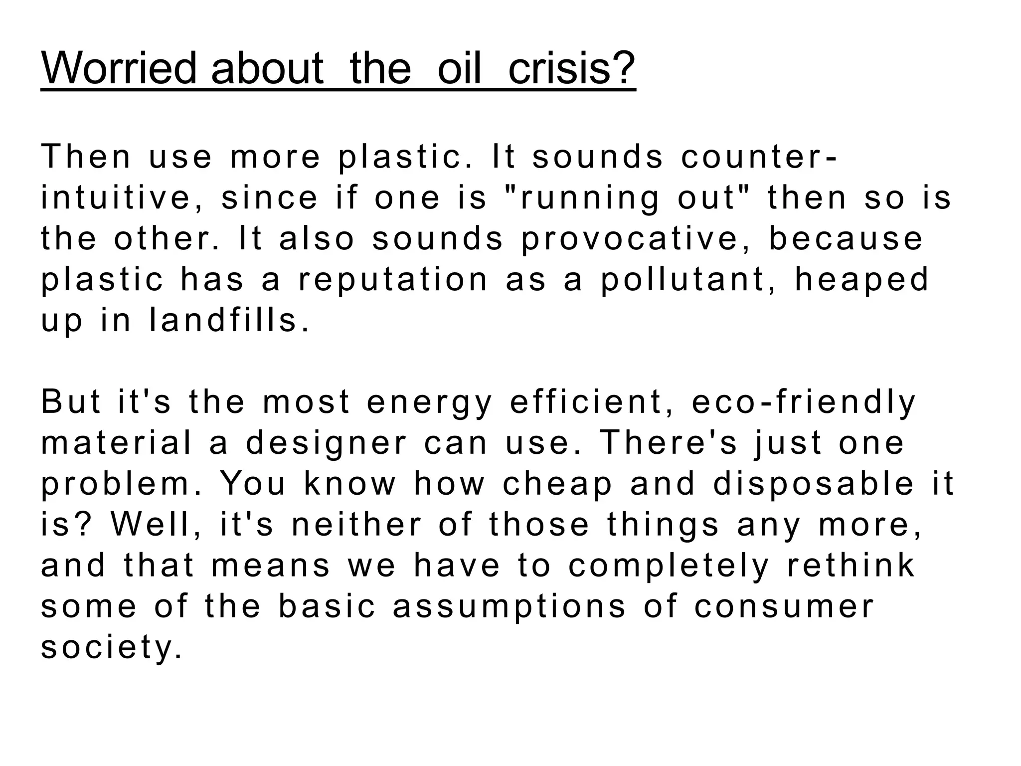 The document discusses how plastic can be a more sustainable material if designed and used properly. It argues that plastic products should be designed to last longer and be more easily repaired or reused to reduce waste. Designers play a key role in convincing consumers that plastics have value when cared for over long periods rather than being disposable. Examples are given of furniture designers creating durable, repairable plastic chairs and a watering can.