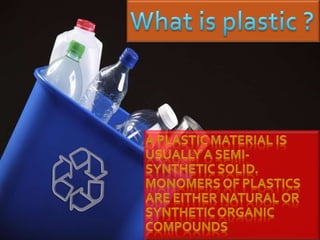The document discusses the arrangement of individual units in plastics, distinguishing between thermoplastics and thermosetting plastics. Thermoplastics are characterized by their ability to become liquid when heated and solidify into a glassy state when cooled. Conversely, thermosetting plastics undergo heavy cross-linking and do not remelt.
