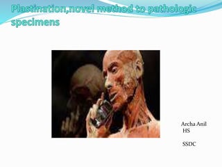 This document discusses the technique of plastination as an alternative to formalin for preserving gross specimens used in teaching oral pathology. It describes the limitations of formalin preservation and provides details on the plastination process, which involves dehydrating tissue, removing lipids, and infiltrating the tissue with curable polymers like silicone. The technique produces specimens that are odorless, non-toxic, and durable for long-term storage and examination. Plastinated specimens are well-suited for teaching as they are easy to handle and interpret structural features. While more complex than formalin preservation, plastination produces high-quality specimens without many of the drawbacks of traditional methods.