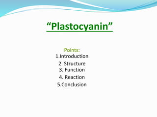 Plastocyanin is a copper-containing protein involved in electron transfer during photosynthesis. It carries electrons from cytochrome f to photosystem I. The structure of plastocyanin has been characterized through X-ray crystallography, revealing a beta-barrel structure and trigonal copper binding site. Plastocyanin cycles between its reduced and oxidized states as it transfers electrons between cytochrome f and photosystem I via specific reaction pathways. As an essential component of photosynthesis, plastocyanin plays an important role in environmental processes.